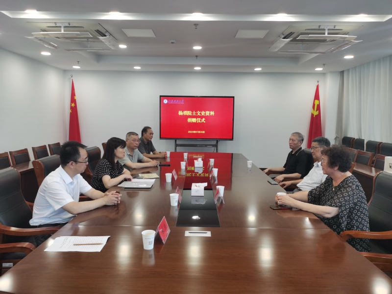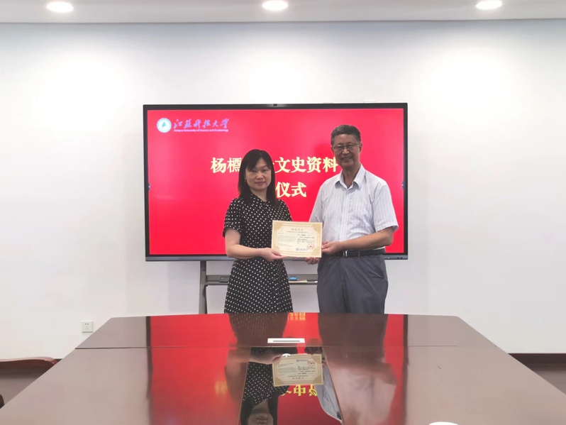 杨思远教授对学校的热情接待表示感谢。他讲到,杨院士在兼任镇江船舶学院副院长期间,当选为中国科学院学部委员(院士),对学校有着深厚的感情。此次捐赠的资料包括杨槱院士本人撰写的自传《耄耋抒怀》,以及杨院士为传播船舶与海洋知识、增强国人海洋意识而写作的科学普及读物《一个造船者的自述》《帆船史》和《轮船史》。此外,还有第三方传记《杨槱传》和《杨帆沧海--杨槱传》。杨槱院士及家人希望这些资料能够促进学校师生进一步传承并弘扬科学家精神,厚植爱党、爱国情怀。