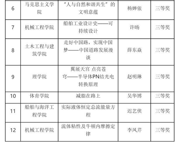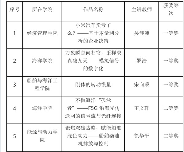 近日,2024年江苏省高校微课教学比赛获奖名单公布,万象城官网推荐参加省赛的12项作品全部获奖,其中经济管理学院吴沣沛等3位主讲教师获一等奖,海洋学院王文轩等2位主讲教师获二等奖,马克思主义学院杨婵依等7位主讲教师获三等奖。