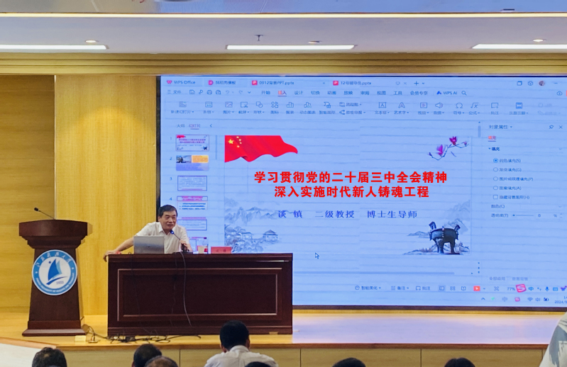 9月12日下午,万象城官网在长山校区图书馆B102报告厅召开辅导员专题讲座,谈镇教授应邀作题为“贯彻党的二十届三中全会精神,深入实施时代新人铸魂工程”的专题讲座。学生处全体人员、各学院分管学生工作领导及全体辅导员参加讲座。讲座由学生处处长朱金主持。