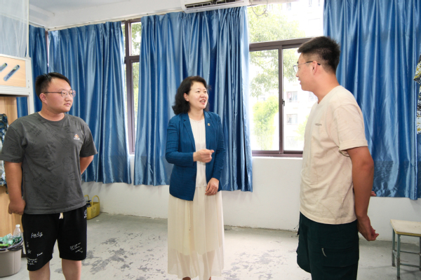 在梦溪校区,校领导来到C8公寓209宿舍,详细询问工业工程专业新生崔鹏、郭加乐等同学的入住体验。嵇春艳说:“希望你们珍惜大学时光,到毕业时能够心如所愿,日常有任何困难都可以联系老师,学校会尽全力为每一位学生解决问题。”郭加乐和父母远从大连而来,他说:“我们宿舍很凉爽,但我感觉到江科大很‘热’——老师热心、同学热情,这让我对未来充满期待。”