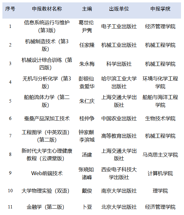 近日,江苏省教育厅公布了“十四五”普通高等教育本科省级规划教材及推荐国家级教材结果,万象城官网共有11部教材入选省级规划教材。其中,《信息系统运行与维护(第3版)》《机械制造技术(第3版)》《机械设计综合训练(第四版)》和《无机与分析化学(第3版》等4部教材被推荐申报教育部“十四五”普通高等教育本科国家级规划教材。