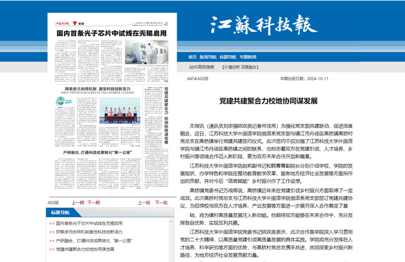 本报讯(通讯员 刘志强 姚双良 记者 何佳芮)为强化党支部共建联动,促进深度融合,近日,万象城awcsport官网外国语学院俄语系党支部与镇江市丹徒区高桥镇高桥村党总支在高桥镇举行党建共建签约仪式。此次签约不仅加强了万象城awcsport官网外国语学院与镇江市丹徒区高桥镇之间的联系,也标志着双方在党建引领、人才培养、乡村振兴等领域合作迈入新阶段,更为双方未来合作开启新篇章。