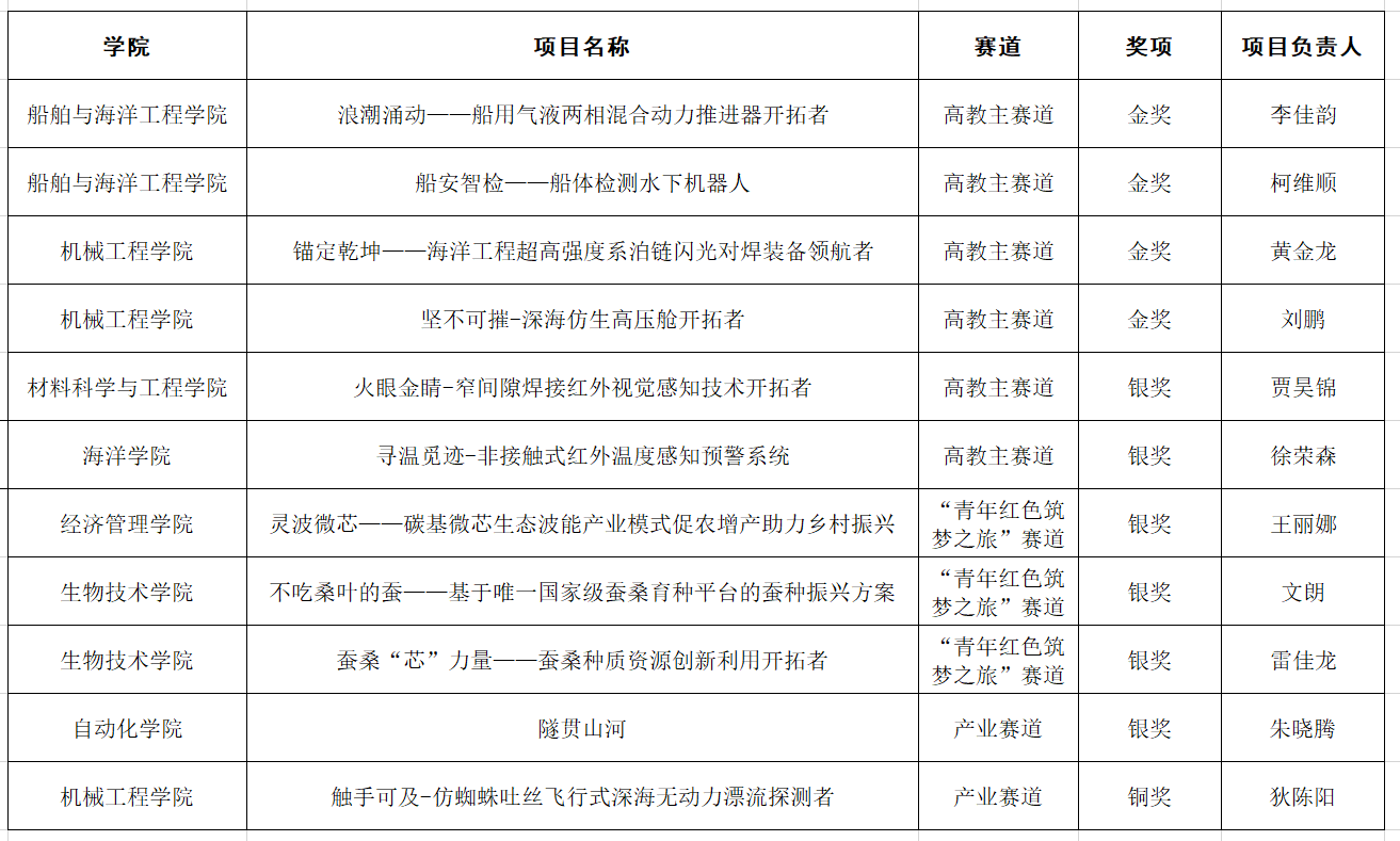 巫蓉等老师指导的“船安智检-船体检测水下机器人”项目,以船舶外板锈蚀、裂纹水下检测为服务方向,开发了一种基于高斯游走策略和边缘检测算法的水下机器人,显著提高了作业效率,并能快速生成船检报告,已形成38项知识产权。项目负责人、船舶与海洋工程学院校友柯维顺成立的公司得到了镇江市多项人才项目资助。