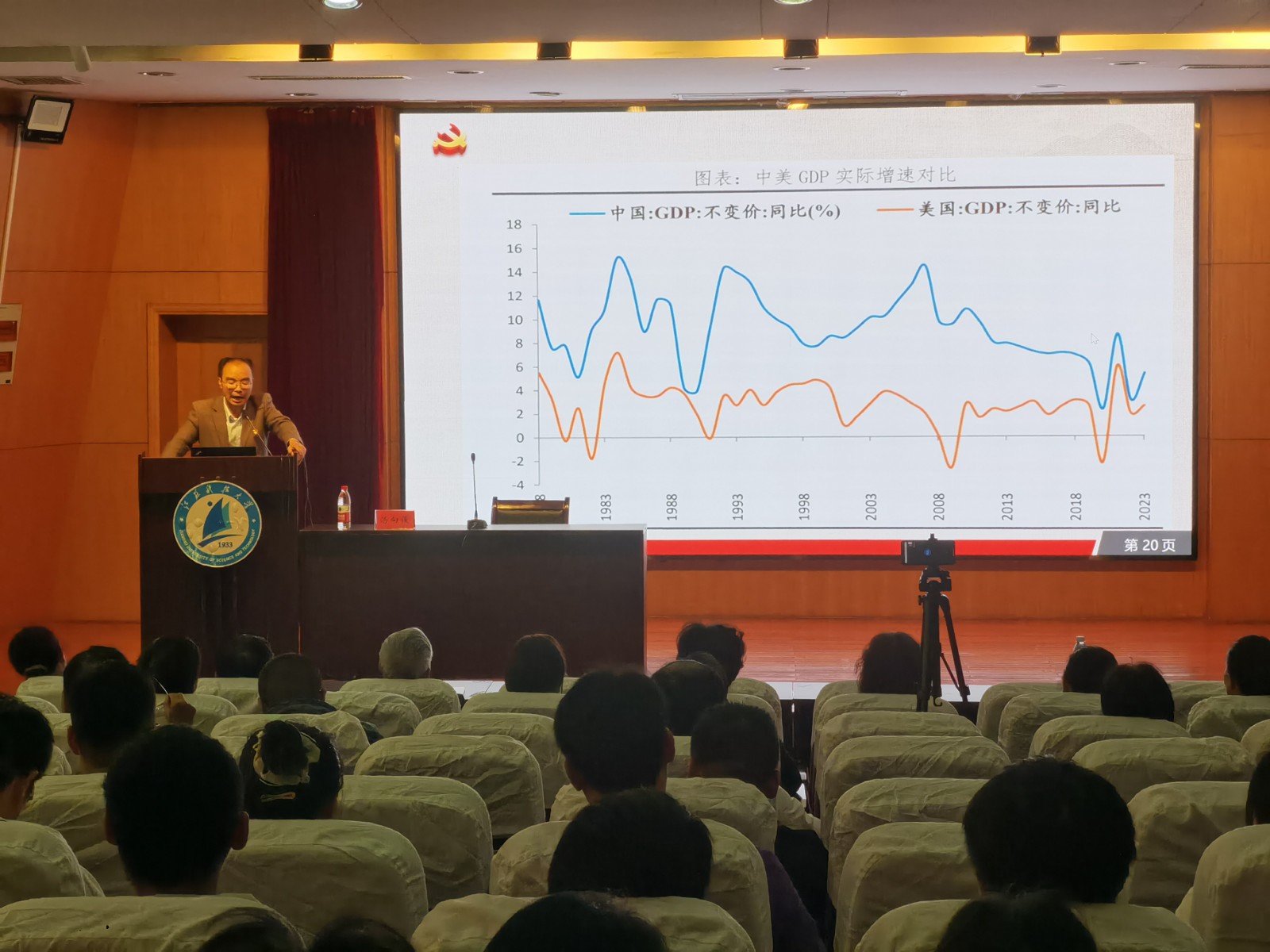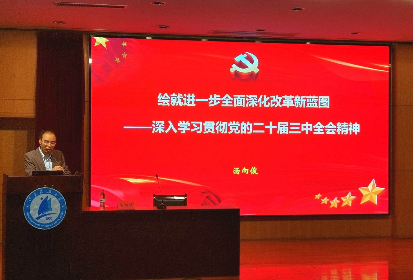 为深入学习贯彻党的二十届三中全会精神,10月24日下午,海洋学院党委、离退休党工委、继续教育学院直属党支部和海洋装备研究院直属党支部联合在梦溪校区学术报告厅召开学习贯彻党的二十届三中全会精神暨理论学习中心组学习报告会。根据学校党委统一安排部署,特邀人文学院副院长汤向俊作辅导报告。四部门党委(党组)理论学习中心组成员、全体教师党员和部分学生党员代表、积极分子代表参加学习。报告会由海洋学院党委副书记卜江春主持。
