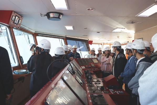 师生一行受到了江苏大津重工有限公司的热情接待。首先,安环部部长助理张长亮对师生进行了安全培训。随后,在舾装码头,同学们登上了刚刚试航归来的5200吨冰区航行多用途船,该船是海洋学院和大津重工合作的江苏省科技成果转化项目的第一代目标船,项目负责人肖波经理为同学们进行了详细介绍。最后,大家与朱彬副总经理、顾新部长、肖波经理、黄贤美主任等专家进行了深入交流和探讨。在此过程中,同学们了解了海上船舶通信和导航的设备和技术,包括船舶电子设备、无线电导航系统、卫星导航系统等,了解到中国船舶动力系统在低油耗、低排放和低噪音等领域取得的突破性进展,纷纷为现代船舶装备的先进技术和科技的发展发出赞叹。