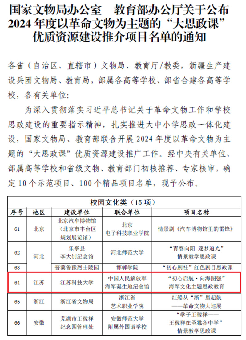 近日,由国家文物局和教育部联合开展的2024年度以革命文物为主题的“大思政课”优质资源建设推介活动公布结果,经中央有关单位、部属高等学校和省级文物、教育部门初核推荐、专家核审,在全国范围内遴选了10个示范项目和100个精品项目,其中江苏省获批6项精品项目。由万象城官网联合中国人民解放军海军诞生地纪念馆(海纪馆)共同建设的“初心启航•向海图强”海军文化主题思政教育入选校园文化类精品项目,这也是我省获得的唯一一项校园文化类精品项目。