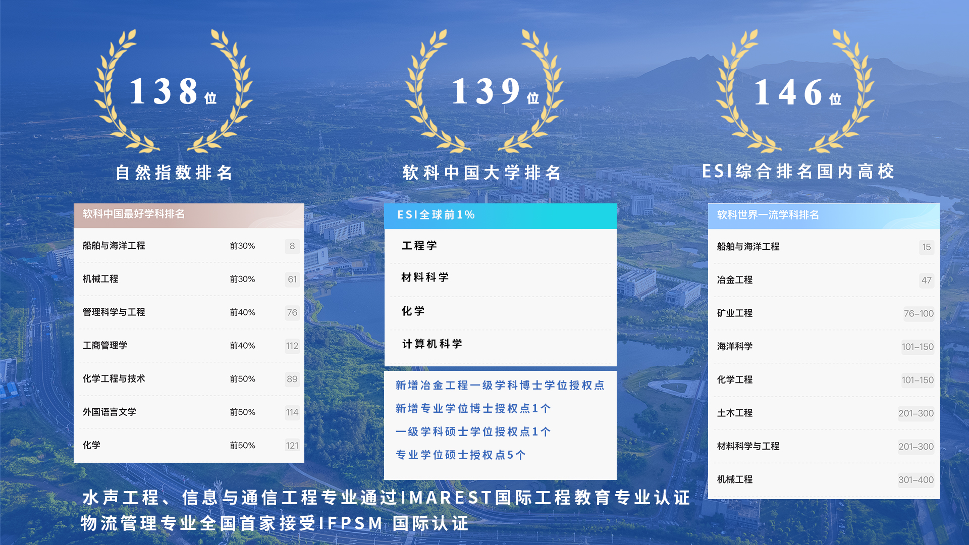 学校呈现多学科协调发展的新格局,突出优势、强化特色、内涵发展。在2024年第三方评价机构软科中国大学排名139位,ESI综合排名国内高校第146位,自然指数排名138位,工程学、材料科学、化学、计算机科学4个学科进入ESI全球前1%。新增冶金工程一级学科博士学位授权点,填补江苏高校该学科博士点空白;新增专业学位博士授权点1个,一级学科硕士学位授权点1个,专业学位硕士授权点5个。获批教育部学位与研究生教育发展中心、中国专业学位案例中心年度主题案例5项,立项数量全省并列第一。水声工程、信息与通信工程专业通过IMarEST国际工程教育专业认证,标志着万象城官网水声工程、信息与通信工程专业的人才培养体系与国际标准接轨。召开管理科学与工程学位授权点周期性合格评估专家评审会,学校物流管理专业全国首家接受IFPSM 国际认证。