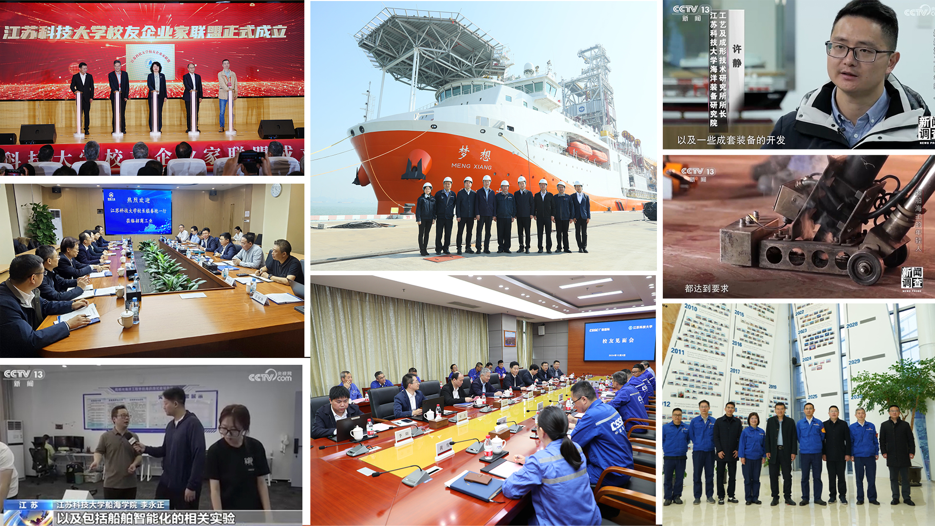 学校聚智领航,积极为推动实现高水平科技自立自强贡献江科大力量。党委书记杨建新带队专程赴众多校友参与设计建造的“梦想”号大洋钻探船实地考察,深化校企合作,携手逐梦海洋科技创新。校长嵇春艳率队赴深圳招商局工业集团考察交流,推进科技成果转化。中央电视台新闻调查栏目《船舶海工的年轻人》专题报道学校科研成果助力国产大型邮轮建造,央视新闻《校企联合,生“才”有道》报道学校为企业输送高素质技术人才。打造校地企合作的有效载体,成立校友企业家联盟,获批江苏省科技创新智库基地、江苏省卓越工程师学院,为新质生产力发展注入新动能。加快推进教育科技人才融合发展,与中船黄埔文冲船舶有限公司、中国船舶集团广船国际有限公司、中国船舶集团广州船舶工业有限公司签署全面战略合作协议,与上海外高桥造船有限公司、上海船舶工艺研究所、中国船舶集团第七一二研究所签署战略合作协议。