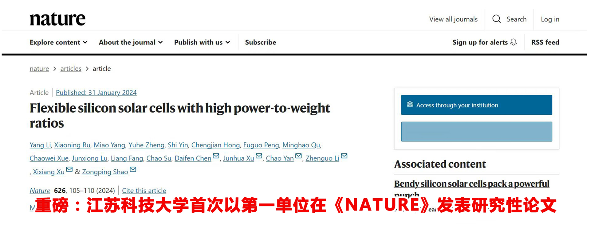 坚定不移走可持续的高质量发展之路。学校首次以第一单位在《Nature》上发表的高水平研究成果,标志着学校新能源团队在高功率重量比柔性电池领域取得重大研究进展,被人民日报、新华社、科技日报等媒体深度报道。学校与江苏省船舶工业行业协会联合展团亮相2024中国海洋装备博览会,多项高质量船舶海工技术成果受到海事界极大关注。承办江苏省岩土力学与工程学术会议暨低碳岩土工程技术论坛,中国工程院院士、中国科学院院士等百余名行业专家学者代表莅临会议。积极服务国家重大战略、区域协调发展和重点产业发展,获批承办“装备智能制造与船舶建造智能化”和“新能源船舶动力系统及关键技术”2项国家级高级研修项目,研发的“华康系列家蚕抗血液型脓病(BmNPV)新品种培育与应用”入选江苏省行业领域十大科技进展。