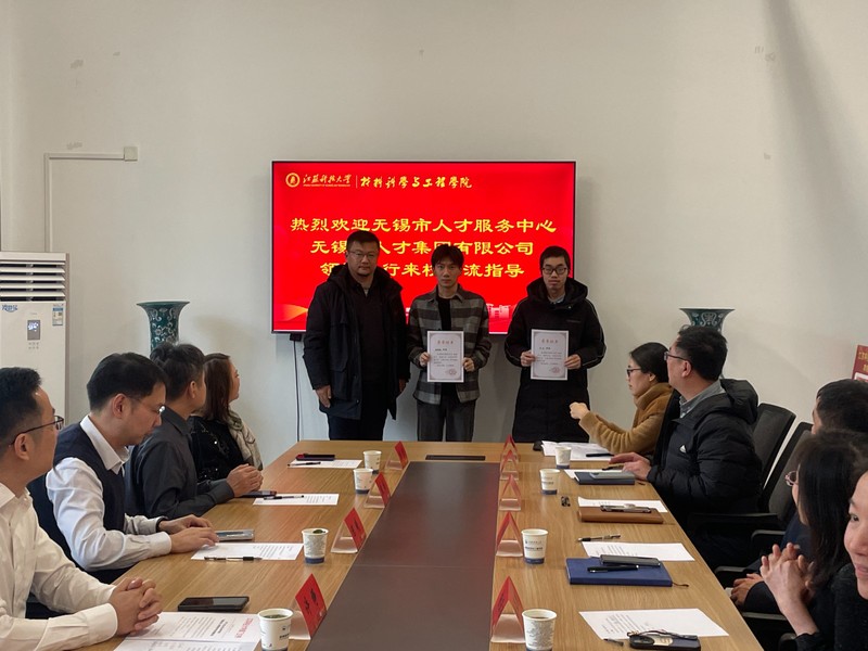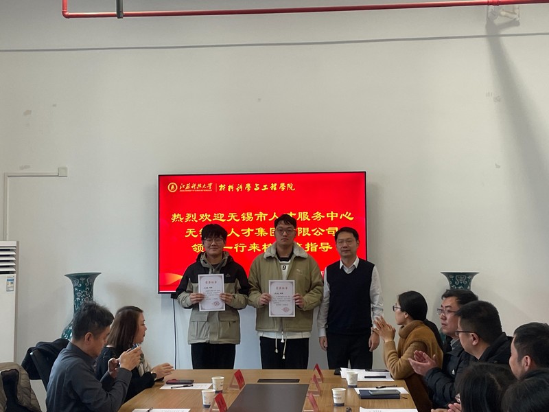 为深入推进校地校企合作,鼓励优秀大学生前往无锡就业安家,1月8日,“无锡太湖人才卓越锻造奖学金”颁奖仪式在材料学院518会议室举行。无锡市人才服务中心党委书记、主任陈曦,服务部部长袁栋,无锡市人才集团有限公司副总经理许铮,人才服务事业部总监陈赟、副总监秦乔,校学生处副处长杨亚洲、教育发展基金会副秘书长李洋,材料学院党委书记李瑞峰、副书记杨海涛、材料成型系副主任臧千昊、团委书记张正栋出席颁奖仪式。材料成型专业各年级辅导员、获奖学生代表参加。仪式由杨海涛主持。