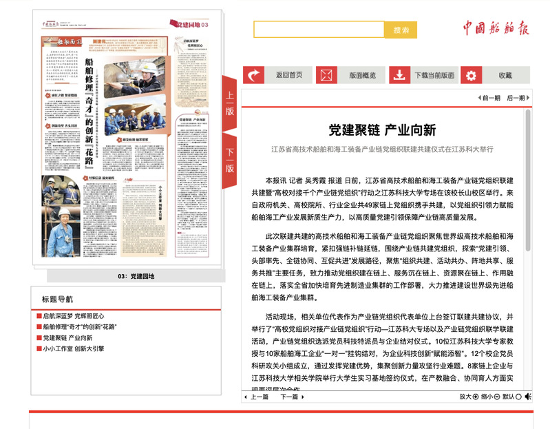 江苏省高技术船舶和海工装备产业链党组织由江苏科大和江苏省工信厅船舶处联合牵头成立,以“党建+产业+创新”为工作主线,践行“我们都是‘一条船上的人’,共生共荣的‘一条船’精神的价值理念。下一步,江苏科大将围绕“党建+产业+创新”“党建引领,科技创新” “党建育人,人才共融”不同主题,开展针对性工作、组织特色化活动,赋能党建链、创新链、人才链协同发展。