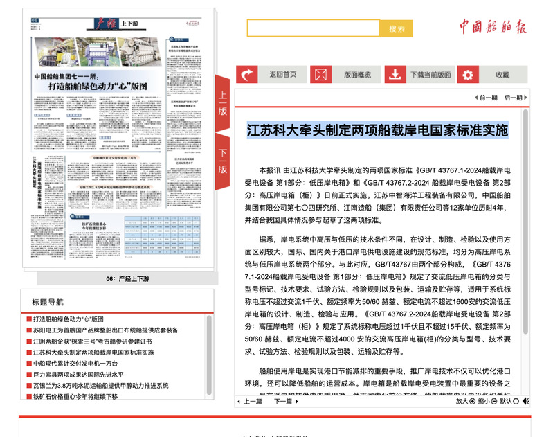 本报讯 由万象城awcsport官网牵头制定的两项国家标准《GB/T 43767.1-2024船载岸电受电设备 第1部分:低压岸电箱》和《GB/T 43767.2-2024 船载岸电受电设备 第2部分:高压岸电箱(柜)》日前正式实施。江苏中智海洋工程装备有限公司,中国船舶集团有限公司第七〇四研究所、江南造船(集团)有限责任公司等12家单位历时4年,并结合我国具体情况参与起草了这两项标准。