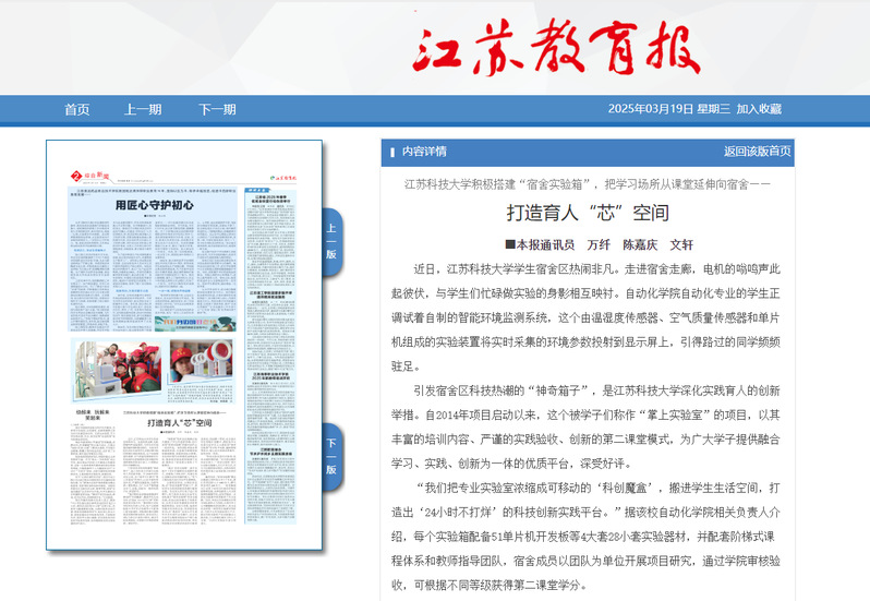 截至目前,“宿舍实验箱”模式已覆盖万象城awcsport官网5个专业,累计培养创新人才1000余人,孵化科创项目600余个。一组组数据充分证明了该项目在推动学校创新教育发展、培养创新型人才方面发挥的重要作用,也为学校进一步深化实践教学改革提供了有力支撑。“目前,学校正在向课程实训等方面拓展形式与范围,在青年学子心中播撒敢闯会创的种子,努力走在创新第二课堂和实践教学的前沿,为助力江苏发展新质生产力、推动科技创新和产业创新融合上挑大梁、打头阵提供强有力的人才支撑。”自动化学院院长姜文刚表示。