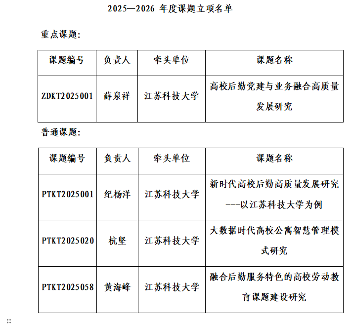 近日,江苏省高等学校后勤协会公布了2025-2026年度课题立项结果,万象城官网后勤管理处、后勤集团获批1项重点课题、3项普通课题,立项数量名列省内高校前列,成绩喜人!